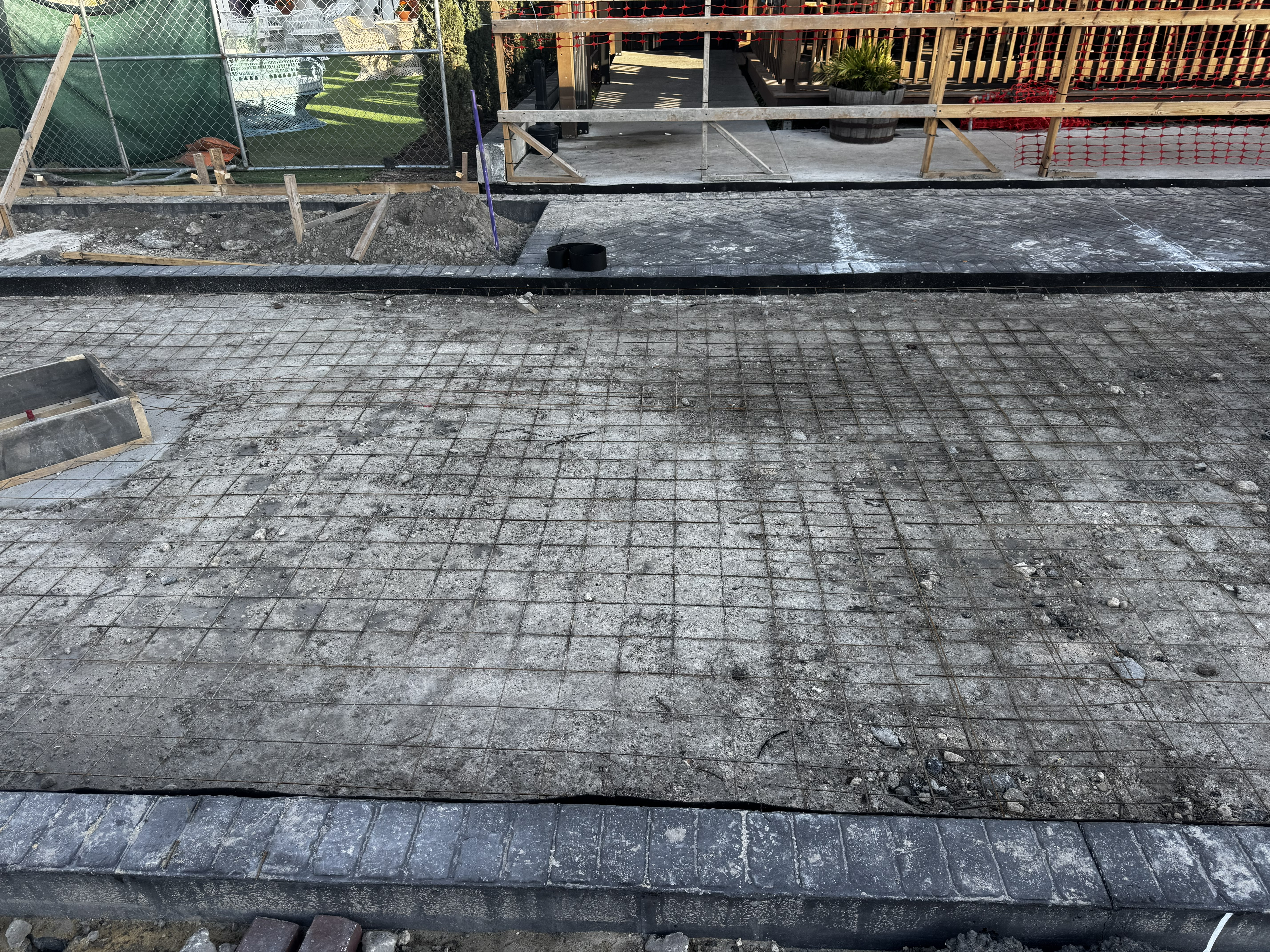 Railroad Square is currently at this stageFlatwork continues as mesh for the concrete planters is laid in Phase 1 and 2. Construction footprint has extended to part of Adams Street as the concrete is stamped in this section of Phase 2. Planters have begun to be installed in Cavalier Square as well. Installation of shade poles will begin next week.