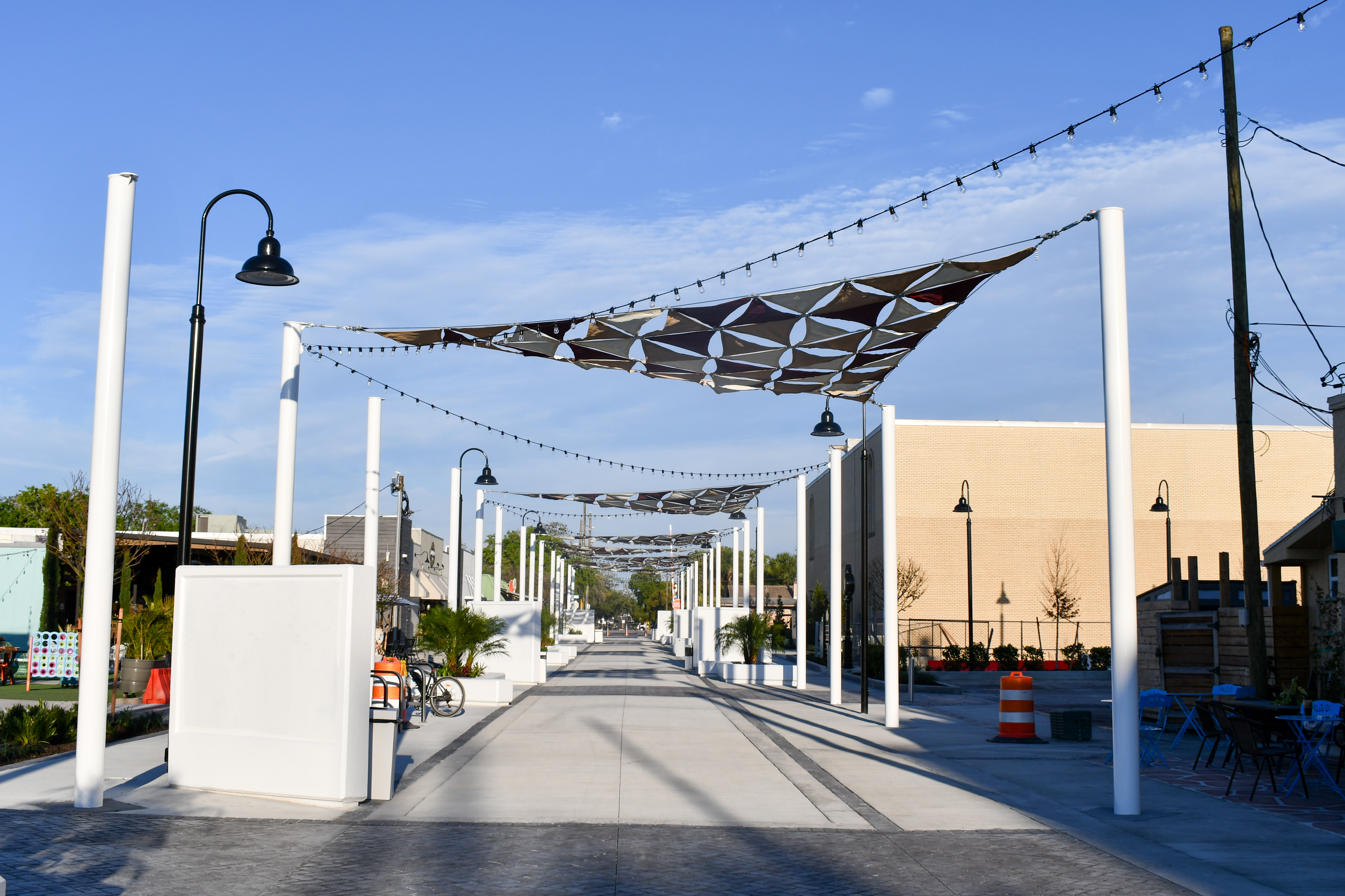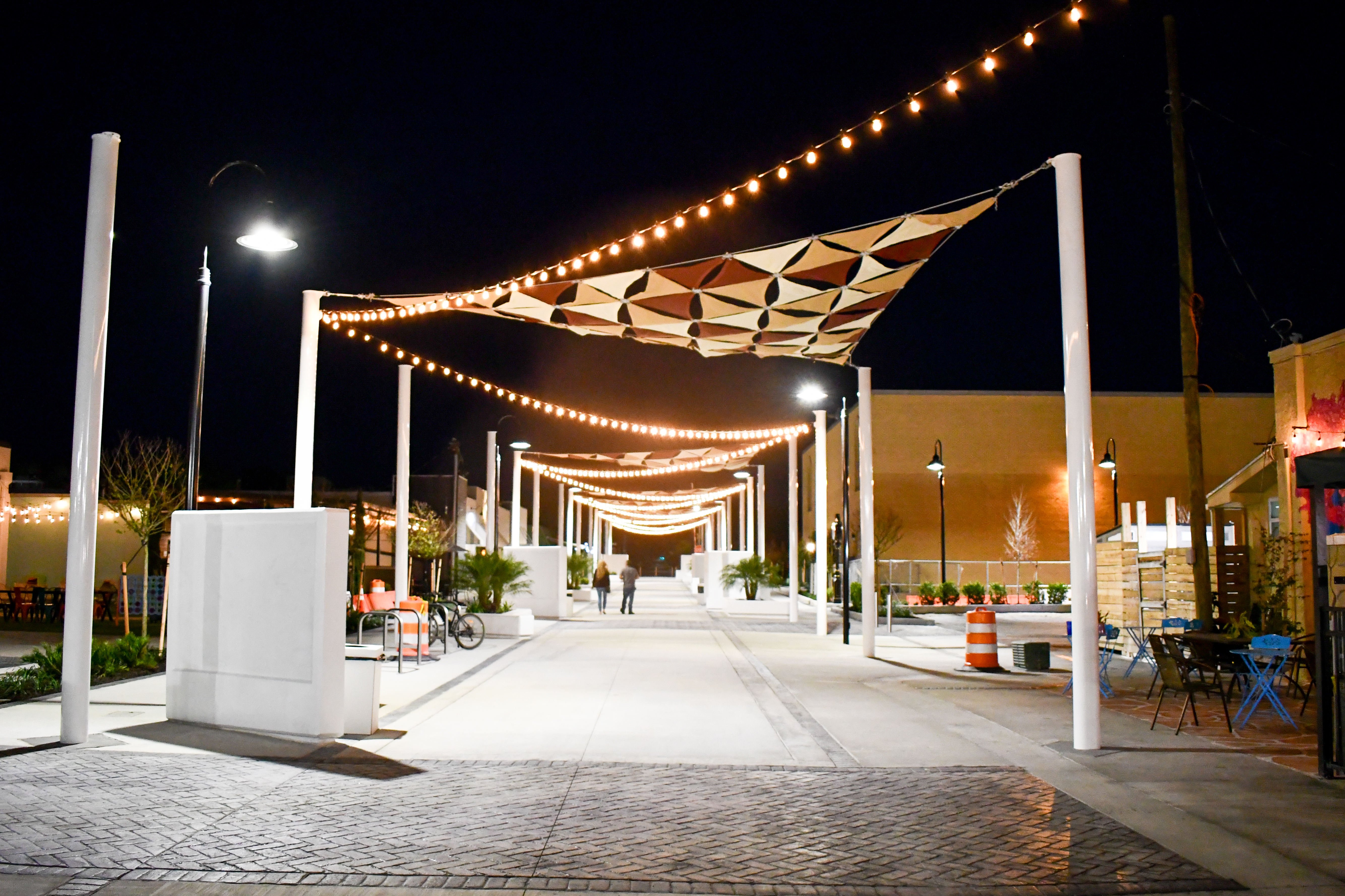 Railroad Square has finished this stageAll sail shades and string lights along Nebraska Avenue are now installed. All cables to prepare for installation in Cavalaire Square are in place, and shade sails and lights should be installed in this area soon. Playground structures will be delivered and installed in the pocket park this week. Half of the parking lot near Cavalaire Square is poured, and the other half will be poured this week. Golf cart parking spots are completed and now available.