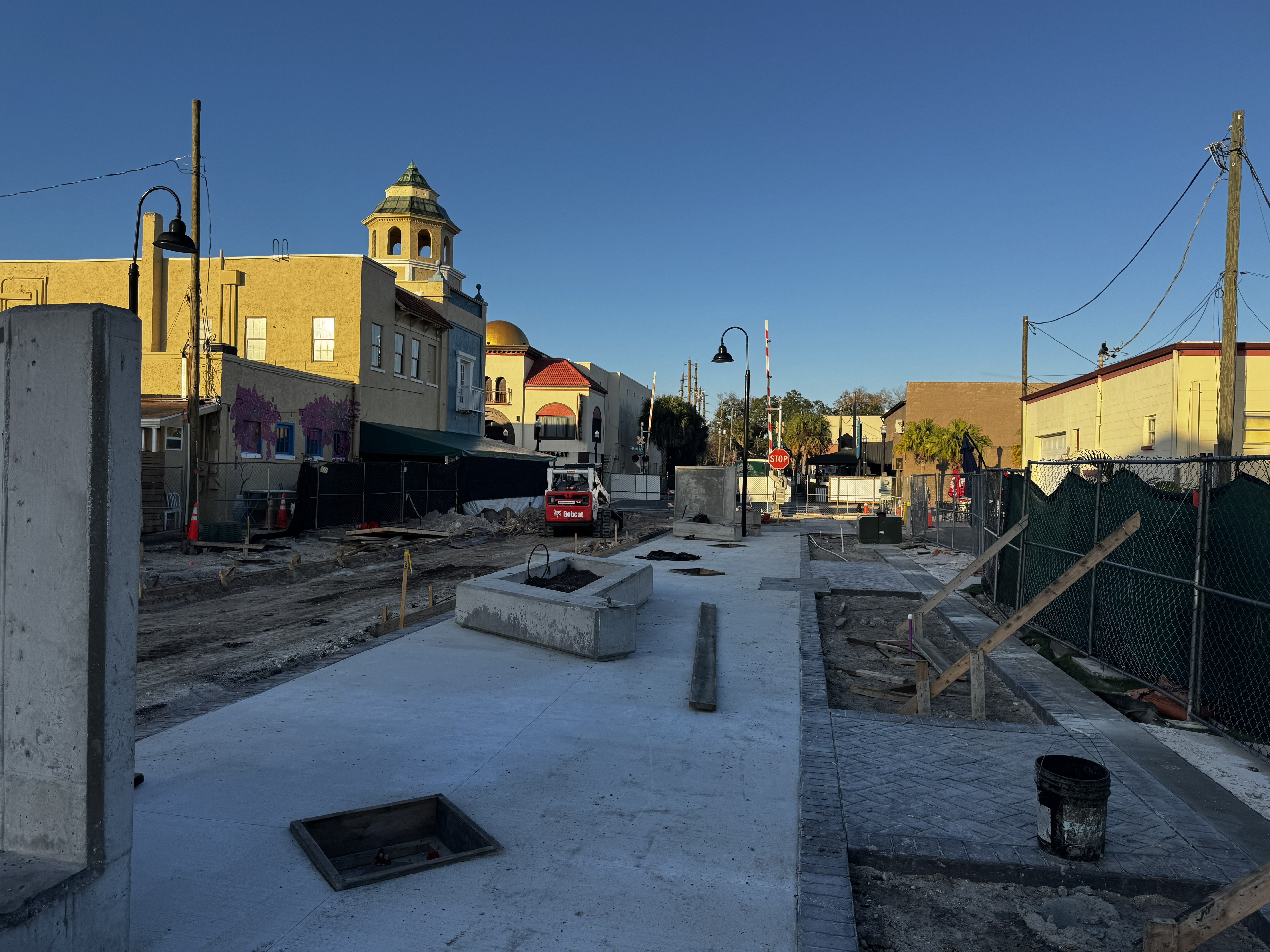 Railroad Square has finished this stageAll planters are officially poured in Phase 1 and Phase 2 locations of the project. They will be painted in the next few months. Flatwork has begun in Phase 1, and all light poles are installed. Irrigation and dirt planters are also done and ready for the landscape installation. Shade sail footers are complete in both Cavalier Square and Railroad Square.